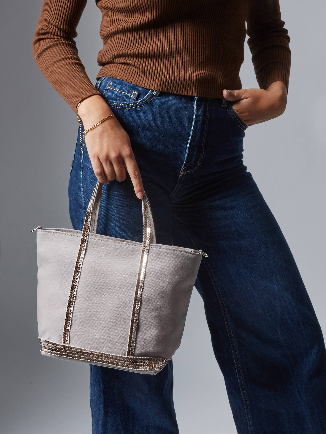 On adore ce sac à main Le Cabas signé Vanessa Bruno. Il est confectionné dans une toile de coton surmonté de paillettes, fabriqué en France dans les ateliers Vanessa Bruno près de Paris. Il s'agit d'une nouvelle taille de cabas, encore plus pratique et légère. Ces dimensions réduites ne vous permettront pas d'inclure beaucoup d'objets inutiles. Ce petit sac à main dispose de deux anses courtes et une bandoulière amovible pour un porté épaule ou croisé.